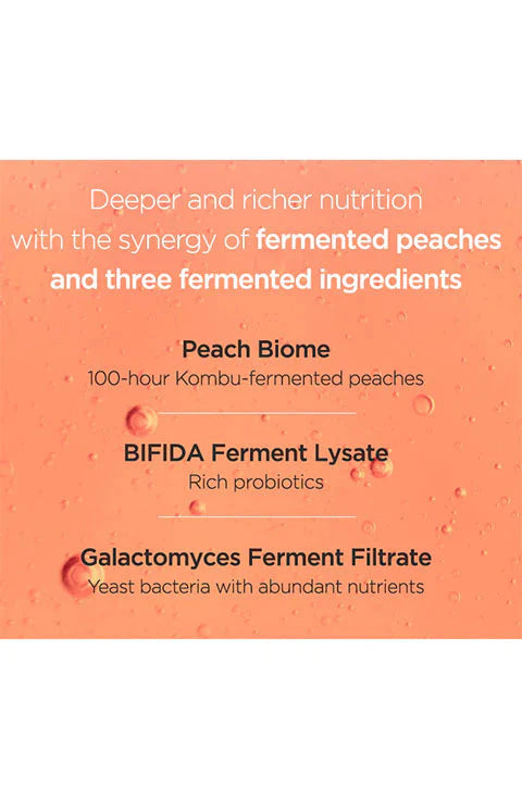 Ingredientes: Prunus Persica (Peach) Fruit Extract(77%), Glycerin, Ethylhexyl Stearate, Dipropylene Glycol, Niacinamide(2%), Methyl Trimethicone, 1,2-Hexanediol, Lactobacillus Ferment, Polyglyceryl-3 Distearate, Cetearyl Alcohol, Hydrogenated Poly (C6-14 Olefin), Prunus Persica (Peach) Flower Extract, Sodium Hyaluronate, Glyceryl Stearate, Sodium Stearoyl Glutamate, Carbomer, Galactomyces Ferment Filtrate, Bifida Ferment Lysate, Water, Arginine, Glyceryl Stearate Citrate, Disodium EDTA, Adenosine, Methylpropanediol, Betaine Salicylate, Panthenol, Cyanocobalamin, Ceramide NP, Saccharomyces Ferment Filtrate, Hydrolyzed Hyaluronic Acid, Sodium Acetylated Hyaluronate, Fragrance, Hydroxyacetophenone, Ethylhexylglycerin