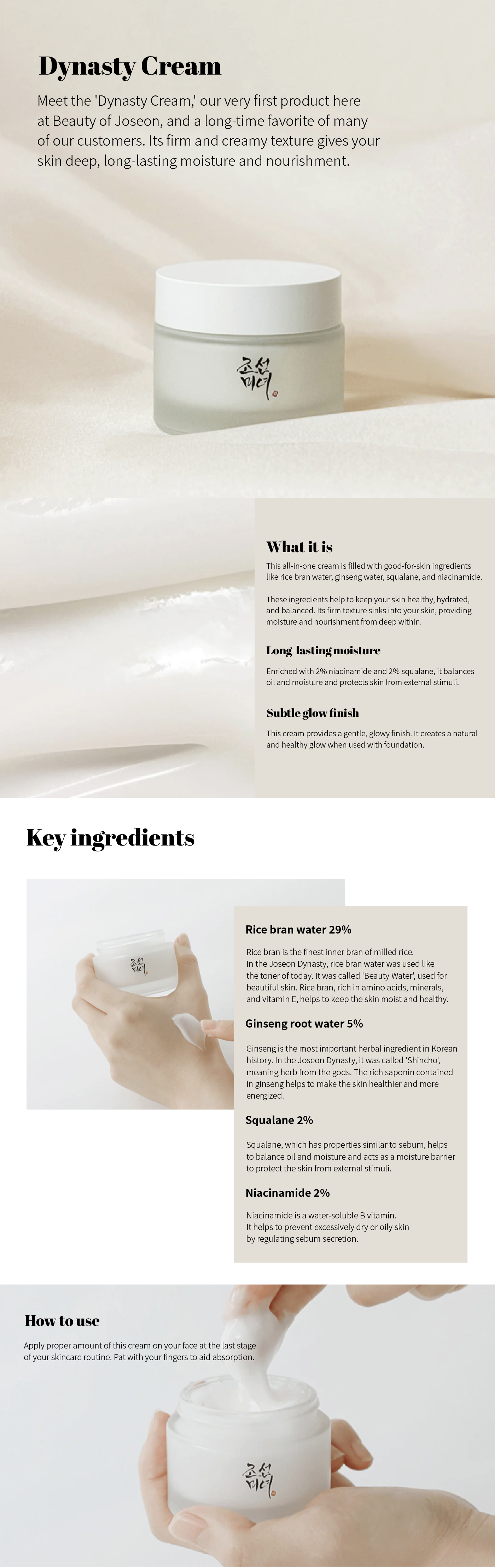 Descripción : Conozca la 'Crema Dinastía', nuestro primer producto del Beauty of Joseon y un favorito de muchos clientes. Su textura firme y cremosa proporciona a su piel una hidratación y nutrición profunda y duradera. Llena de ingredientes beneficiosos como agua de salvado de arroz, agua de ginseng, escualano y niacinamida, mantiene su piel saludable y equilibrada. Su consistencia firme se absorbe en la piel, brindando hidratación y nutrición desde el interior.