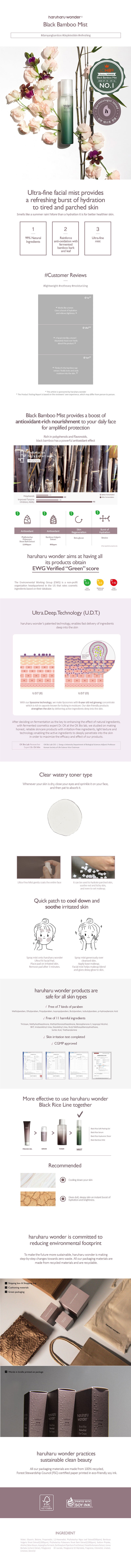 Descripción: Haruharu Wonder Black Bamboo Mist es una bruma facial ultrafina con un 95% de ingredientes de origen natural que hidrata, calma y refresca la piel de inmediato. Enriquecida con extracto de bambú negro fermentado, betaína y beta-glucano, fortalece la barrera cutánea, mejora la elasticidad y combate la irritación y el exceso de sebo, siendo ideal para pieles sensibles o con tendencia al acné. Su fórmula ligera se absorbe rápidamente sin dejar sensación pegajosa.