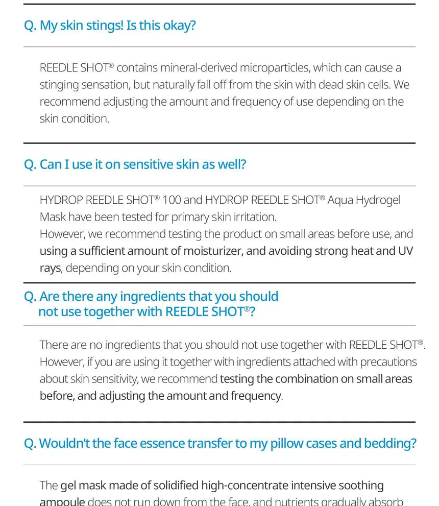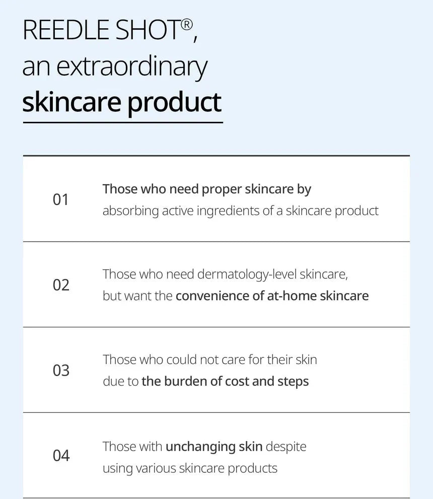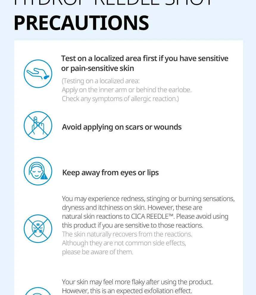 En el Paso 1, el Hydrop Reedle Shot 100hL proporciona una hidratación intensiva con ácido hialurónico de ultra bajo peso molecular, que penetra profundamente sin dejar sensación de sequedad. En el Paso 2, la mascarilla de tejido está elaborada con una mezcla de tres tipos de microfibras ultrafinas que se ajustan cómodamente al rostro, permitiendo que la esencia hidratante y nutritiva se absorba por completo.