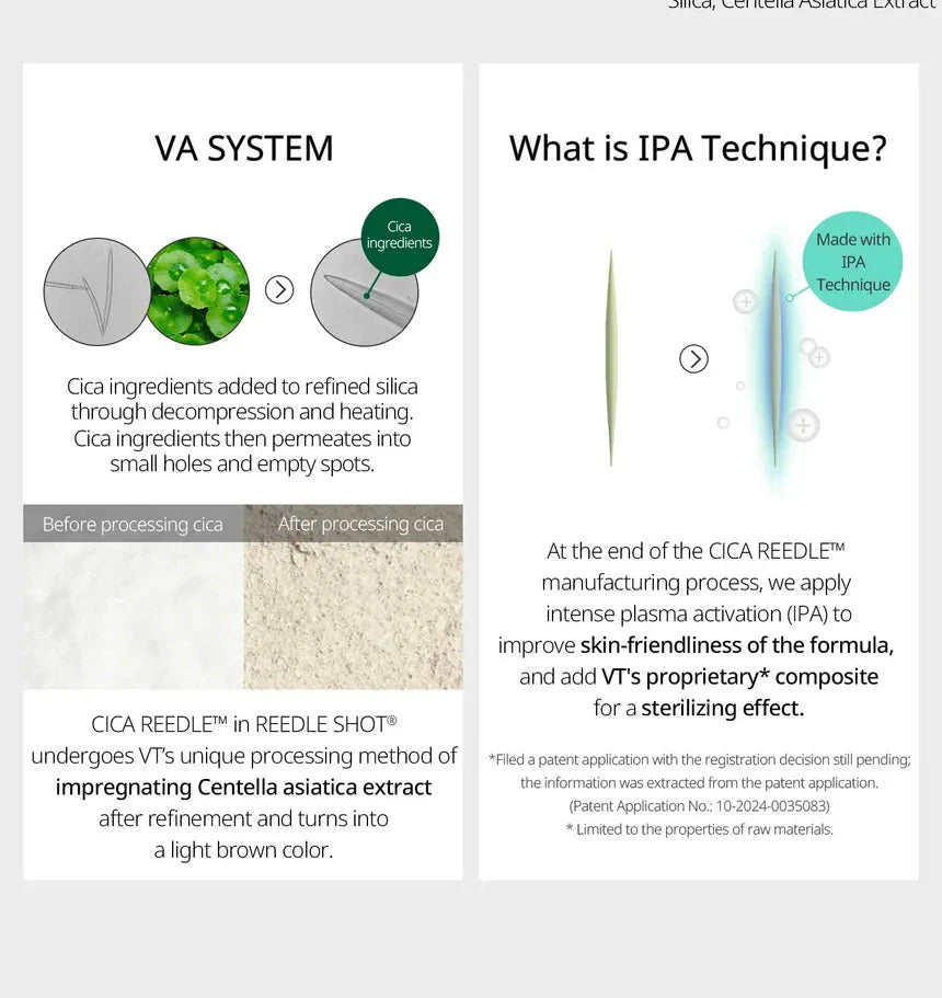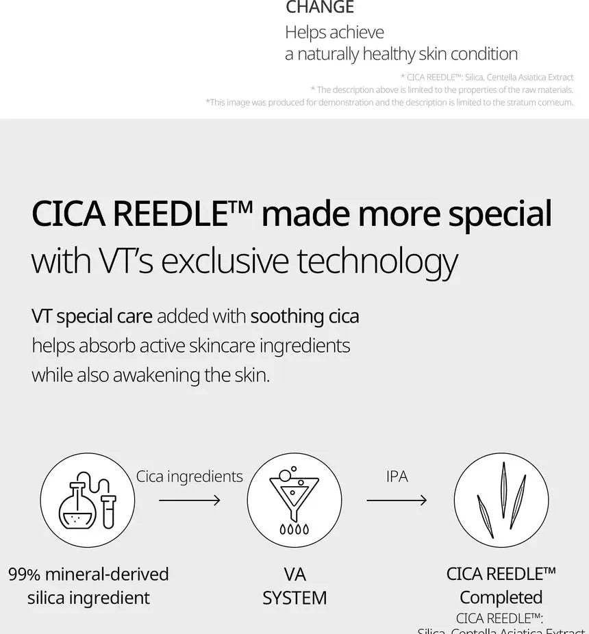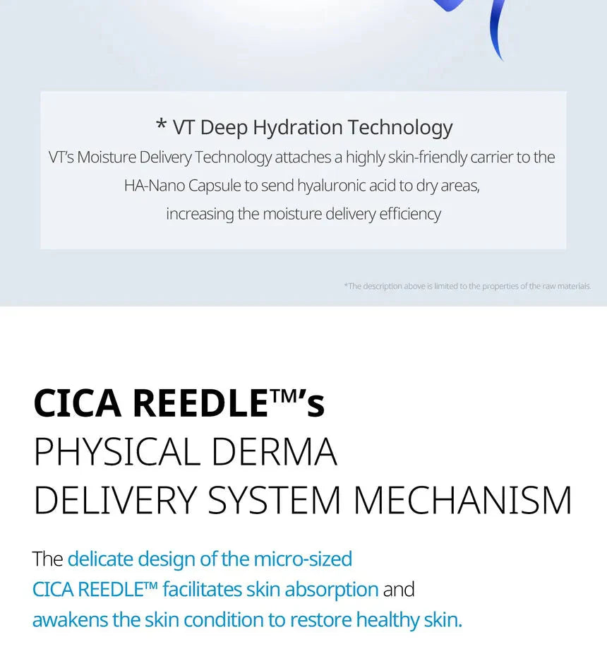 Descripción: VT Hydrop Reedle Shot 100hL 2-Step Mask es una mascarilla en dos pasos especialmente formulada para hidratar en profundidad y restaurar el equilibrio de la piel desde el interior. Gracias a la tecnología Hydrop Reedle Shot, esta mascarilla estimula la piel con microagujas de Cica de diseño delicado, mejorando la absorción de los ingredientes activos y favoreciendo una piel más saludable y revitalizada.