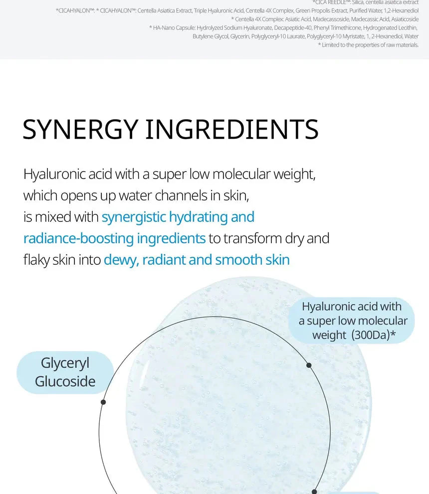 Ingredientes: Agua purificada, glicerina, dipropilenglicol, niacinamida, 1,2-hexanodiol, trehalosa, betaína, eritritol, polímero cruzado de acrilatos/acrilato de alquilo C10-30, trometamina, hidroxiacetofenona, caprilil glicol, adenosina, etilhexilglicerina, EDTA disódico, butilenglicol, extracto de hoja de guayaba, extracto de flor de guayaba, extracto de fruto de calabaza hiedra, hialuronato de sodio, extracto de fruto de berenjena, extracto de centella asiática, extracto de hoja de albahaca sagrada, extracto de coral, extracto de raíz de cúrcuma, sílice, extracto de hoja de Myrotamnus flavellifolia, fenil trimeticona, laurato de poligliceril-10, miristato de poligliceril-10, extracto de propóleo, hialuronato de sodio hidrolizado, lecitina hidrogenada, asiaticósido, ácido asiático, ácido madecásico, madecasósido. Decapéptido-40