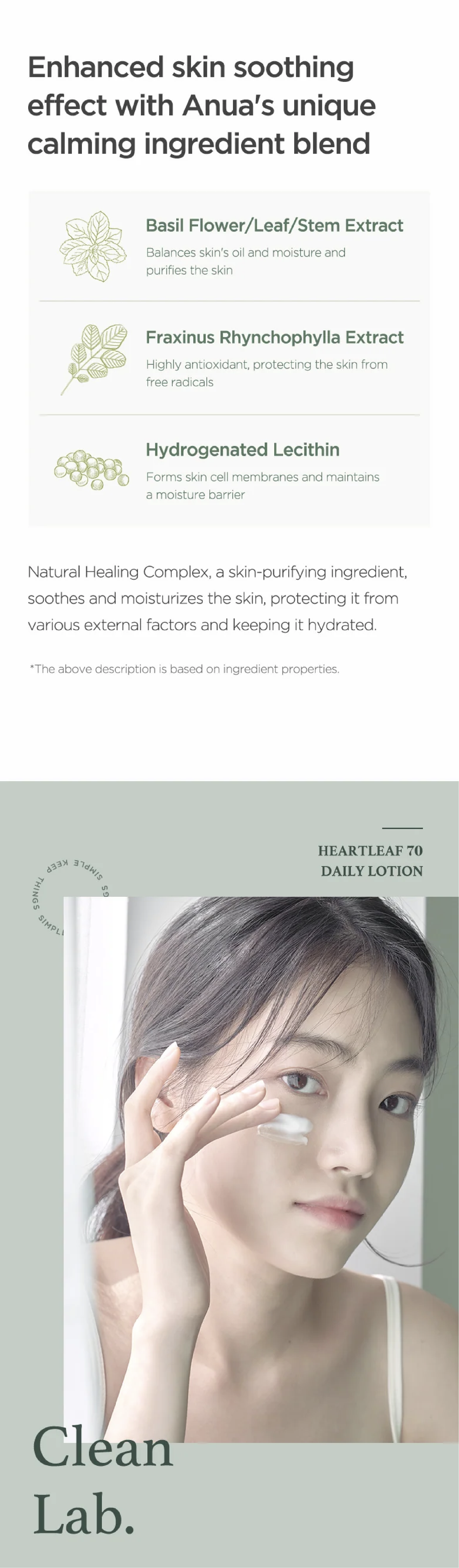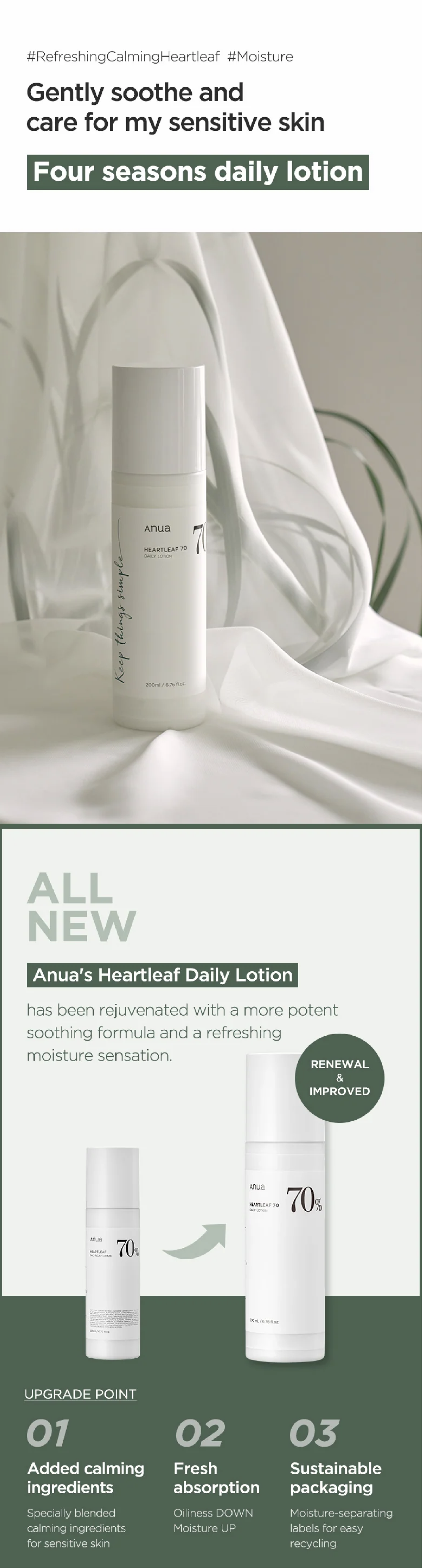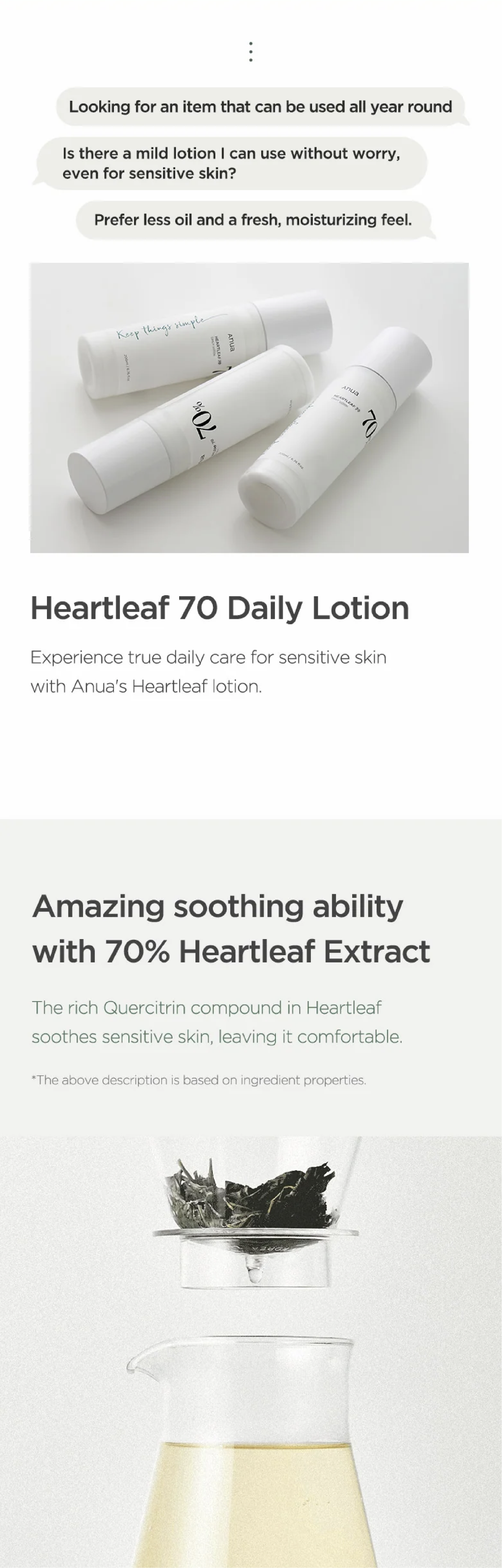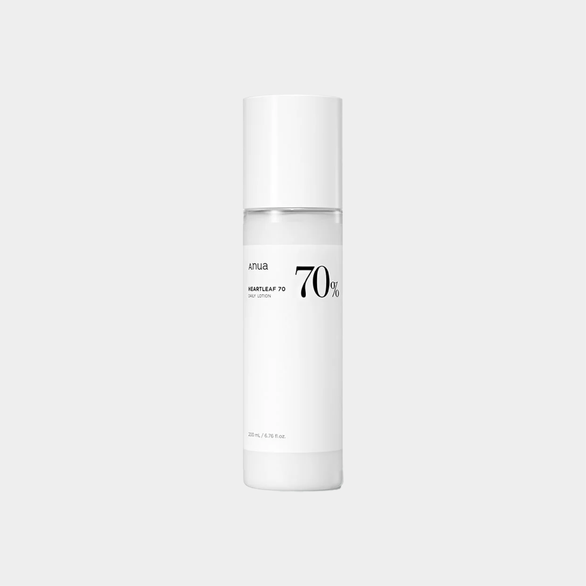Descripción : Anua Heartleaf 70% Daily Relief Lotion es una crema ligera especialmente formulada para pieles sensibles y con tendencia a ser grasa. Contiene un 70% de Extracto de Houttuynia Cordata(Heartleaf), que calma y alivia la piel inflamada y enrojecida, brindando un cuidado diario suave, antiinflamatorio, antioxidante y efectivo.