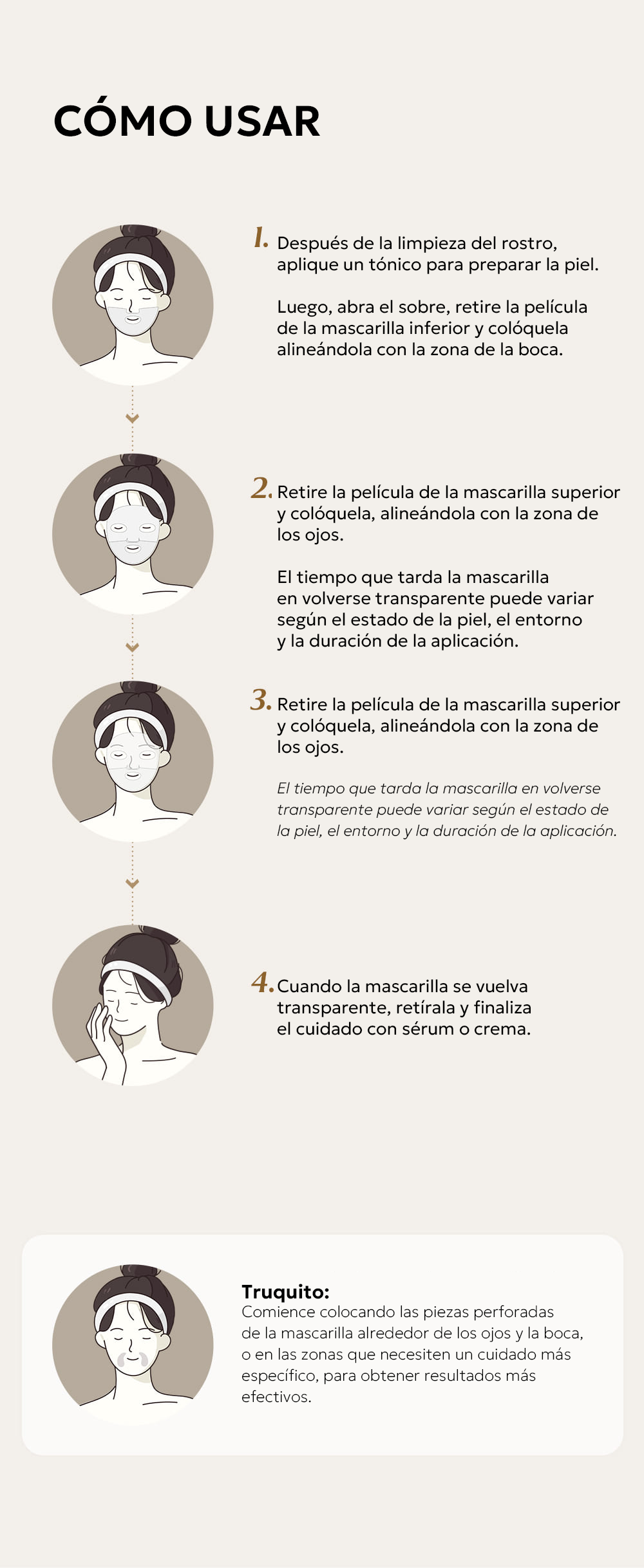 Espera de 1 a 3 horas hasta que la mascarilla se vuelva completamente transparente (el tiempo puede variar según el tipo de piel y ambiente).