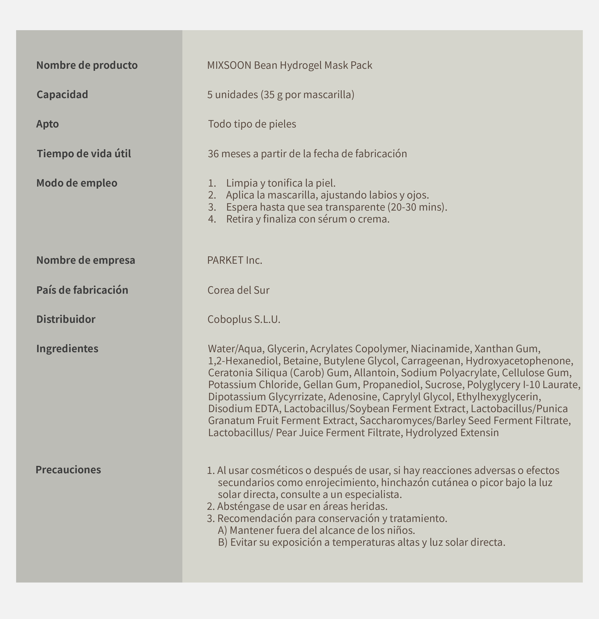 Descripción: Bean Collagen Hydrogel Mask Pack de mixsoon es una mascarilla de hidrogel de alta adherencia, compuesta 100% por una esencia concentrada que se transforma en una película transparente al absorberse en la piel. Enriquecida con una mezcla fermentada de soja, cebada, pera y granada, junto con colágeno de origen vegetal, esta mascarilla hidrata intensamente, mejora la elasticidad y devuelve el brillo natural del rostro. La textura de gel altamente nutritiva se ajusta perfectamente a los contornos faciales sin dejar espacios, proporcionando un tratamiento profundo reafirmante, iluminador y suavizante.