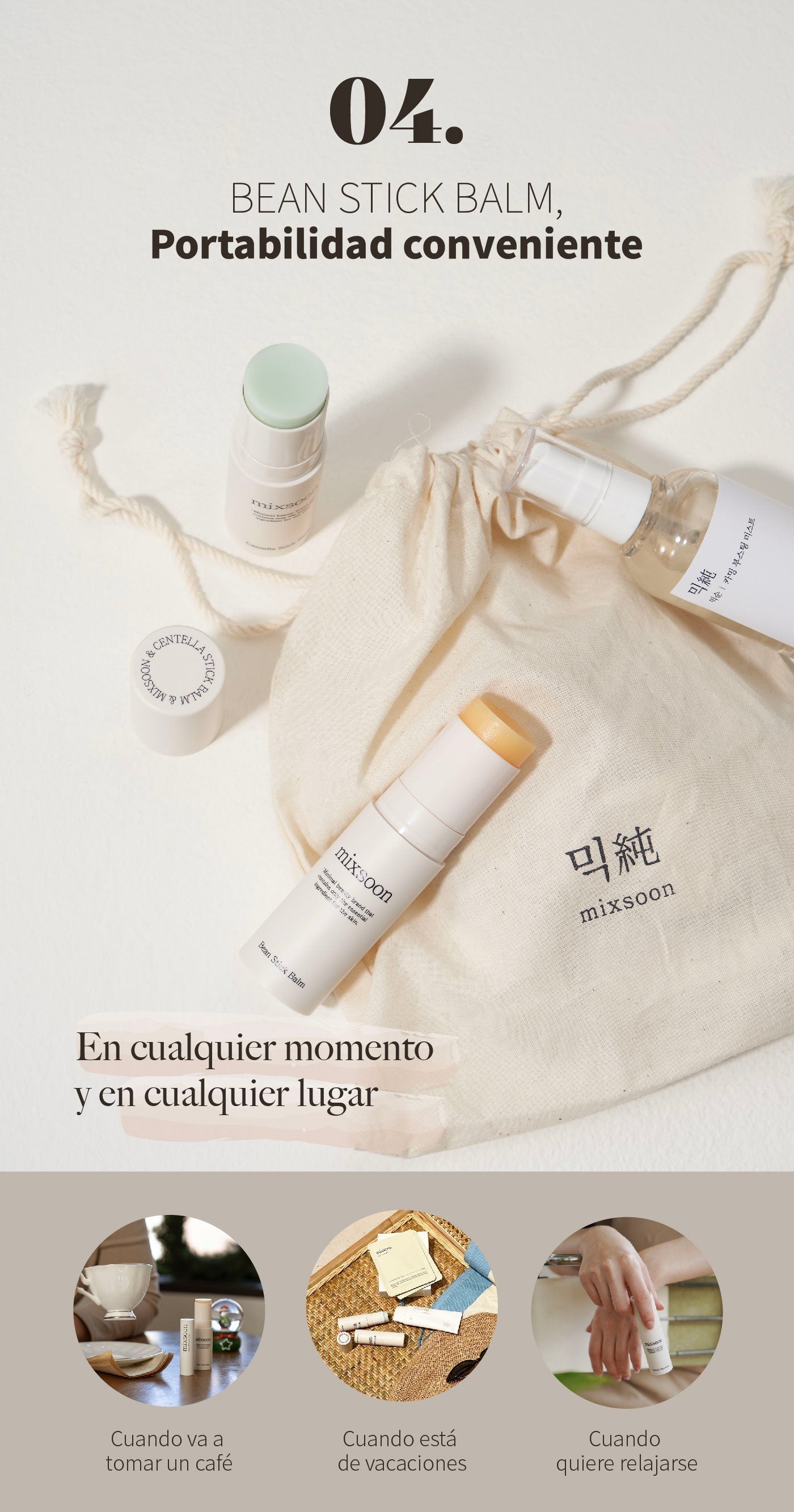 Descripción : mixsoon bean sick balm es un bálsamo facial en barra. Hecho con el ingrediente más simbólico de Mixsoon, soja fermentada, de donde se extraen nutrientes ricos como aminoácidos, proteínas y vitaminas. Ayuda a mantener la piel saludable con función de antiarrugas, revitalizador e hidratante.