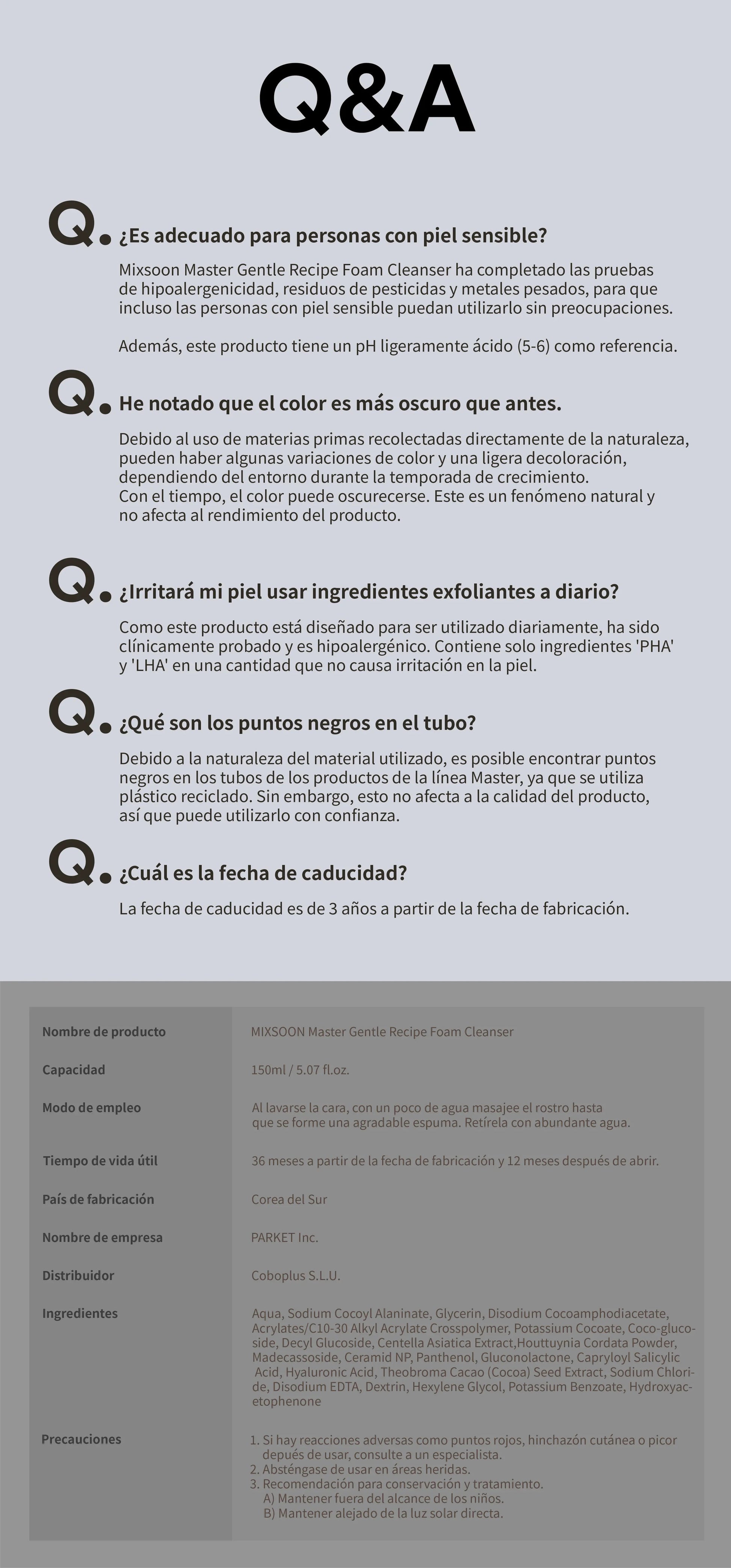 Descripción : mixsoon Master Gentle Recipe Foam Cleanser, infundido con extracto Centella Asiática, polvo de Houttuynia Cordata y Madecassoside, elimina eficazmente el exceso de sebo y las células muertas de la piel para lograr una piel limpia y calmada. La textura gel se convierte en espuma rápidamente para una limpieza suave pero completa.