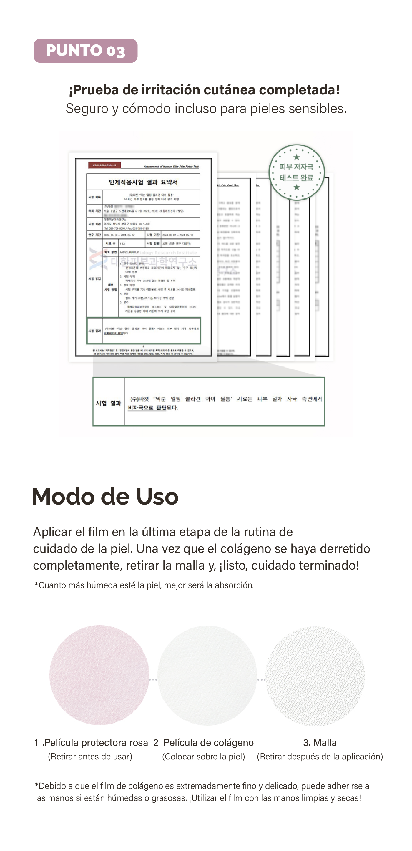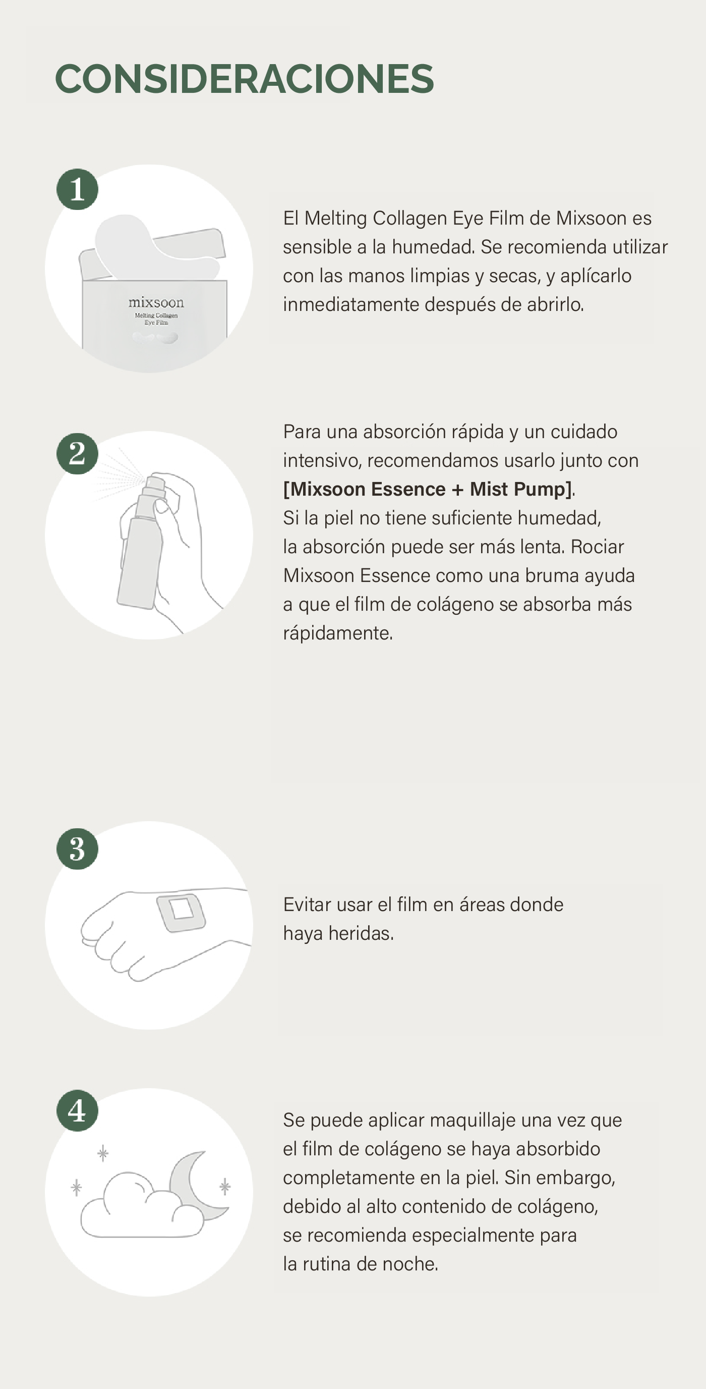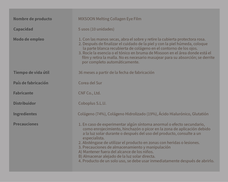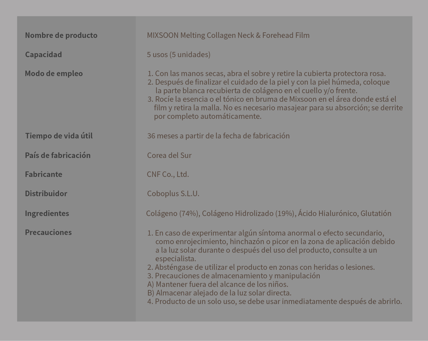 Descripción : mixsoon Melting Collagen Neck & Forehead Film es una película que se adhiere firmemente al área del cuello y la frente y que se derrite al instante. Adecuada para aquellos que notan arrugas y flacidez en estas zonas. Proporciona una sensación de revitalización y firmeza gracias a su contenido de colágeno, glutatión y ácido hialurónico, que mejoran el tono y proporcionan hidratación profunda. Fórmula hipoalergénica que ha pasado la prueba de irritación cutánea.