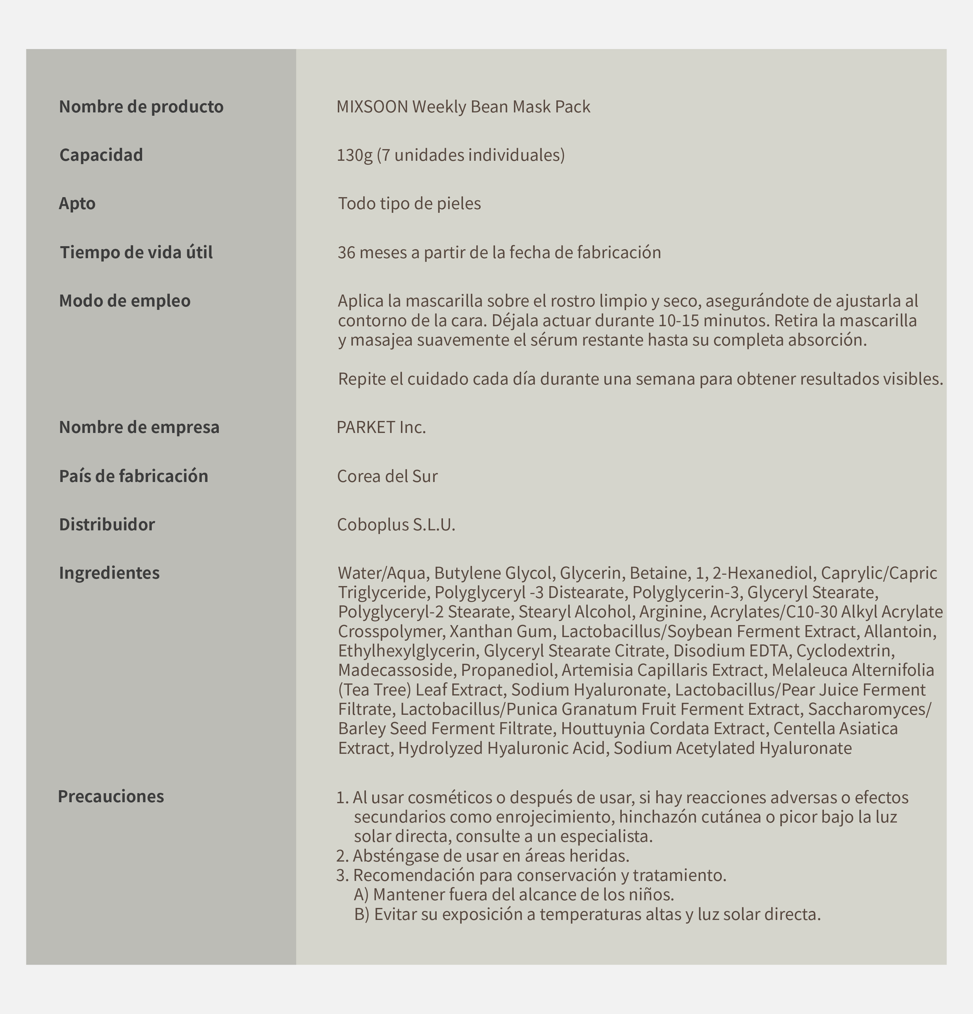 Descripción: mixsoon Weekly Bean Mask Pack es una mascarilla tipo crema en formato pouch diseñada para ofrecer una rutina intensiva de 7 días. Con una fórmula enriquecida a base de ingredientes fermentados como frijol, cebada, granada y jugo de pera, proporciona una nutrición intensa y una hidratación profunda con cada aplicación diaria.