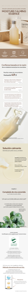 Descripción :Nuestra esencia Moisture Calming Essence está enriquecida con extracto orgánico de Centella Asiática, proporcionando un potente alivio para el enrojecimiento y ayudando en la reparación de la barrera cutánea. Descubra una esencia calmante de rápida absorción que proporciona un alivio instantáneo, dejando la piel fresca en la superficie e hidratada en profundidad. Hemos aprovechado al máximo los componentes beneficiosos de la Centella Asiática utilizando un método de extracción en frío, garantizando así su eficacia. Sus efectos potentes combinados con su textura ligera, hace que tenga un índice de irritación cutánea de cero, lo que la hace adecuada para todo tipo de pieles.