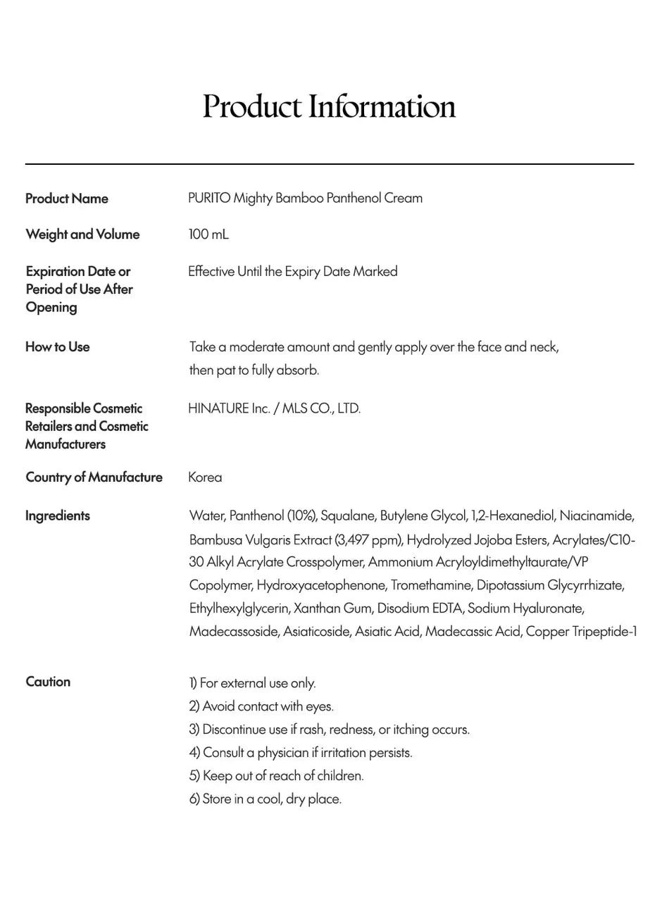 Descripción: Purito Seoul Mighty Bamboo Panthenol Cream es una crema hidratante intensiva formulada con 10% de pantenol (provitamina B5) y extracto de bambú, dos ingredientes clave que fortalecen la barrera cutánea y proporcionan una hidratación profunda y duradera.