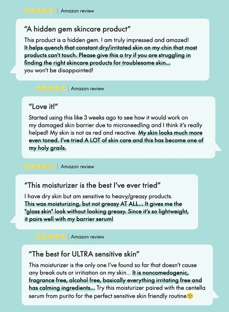 Ingredientes: Water, Panthenol, Squalane, Butylene Glycol, 1,2-Hexanediol, Niacinamide, Bambusa Vulgaris Extract, Hydrolyzed Jojoba Esters, Acrylates/C10-30 Alkyl Acrylate Crosspolymer, Ammonium Acryloyldimethyltaurate/VP Copolymer, Hydroxyacetophenone, Tromethamine, Dipotassium Glycyrrhizate, Ethylhexylglycerin, Xanthan Gum, Disodium EDTA, Sodium Hyaluronate, Madecassoside, Asiaticoside, Asiatic Acid, Madecassic Acid, Copper Tripeptide-1.