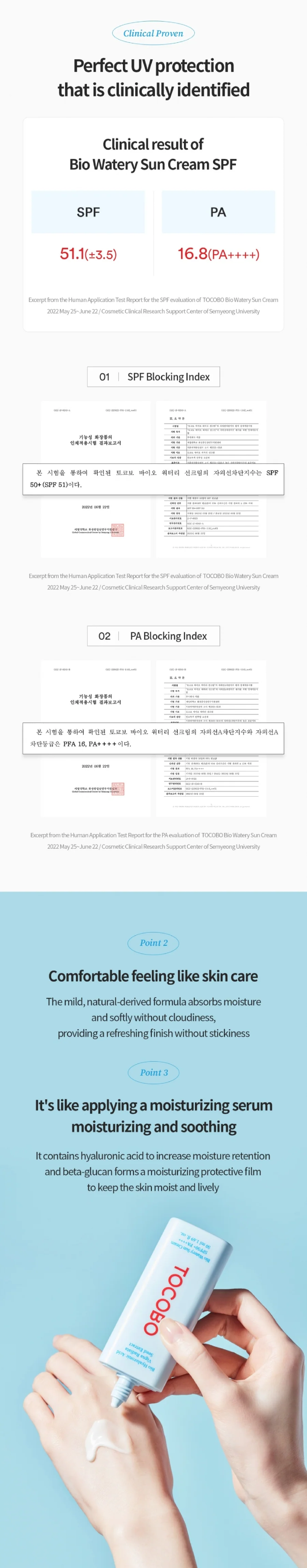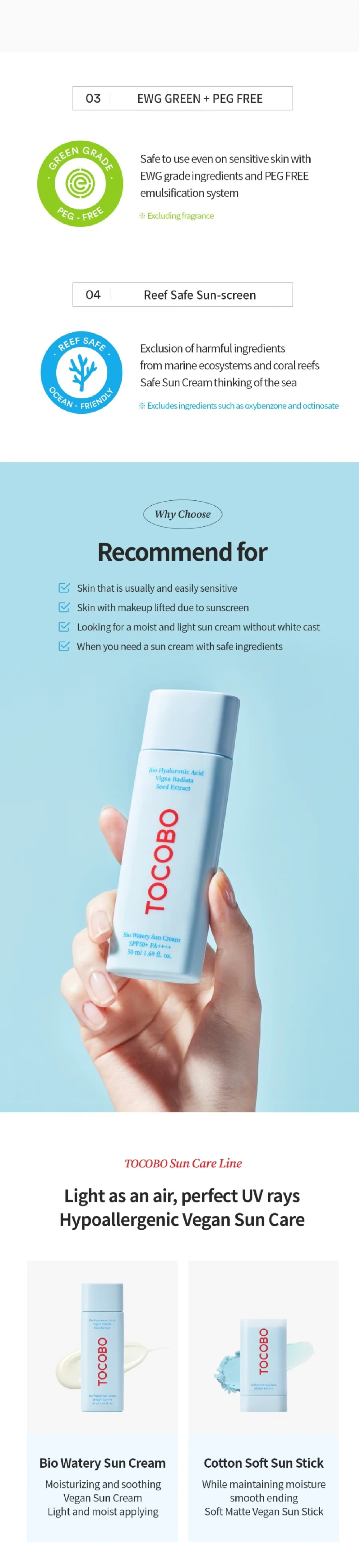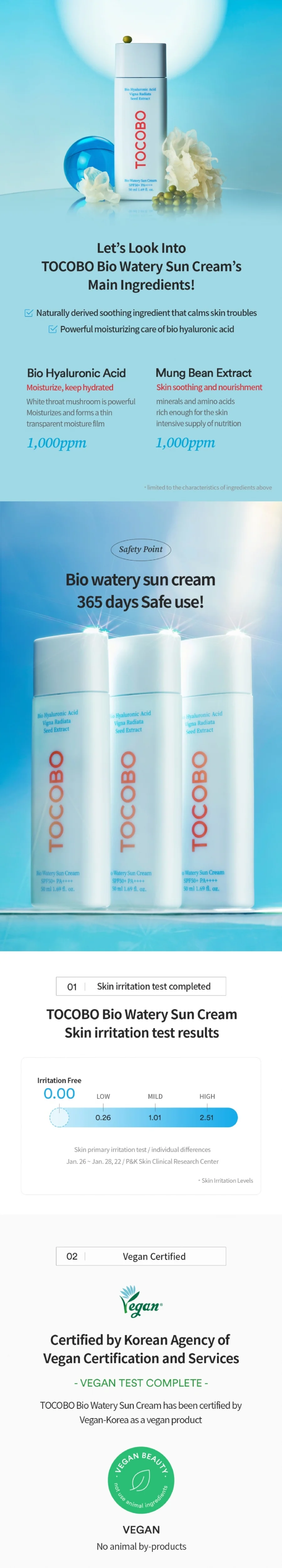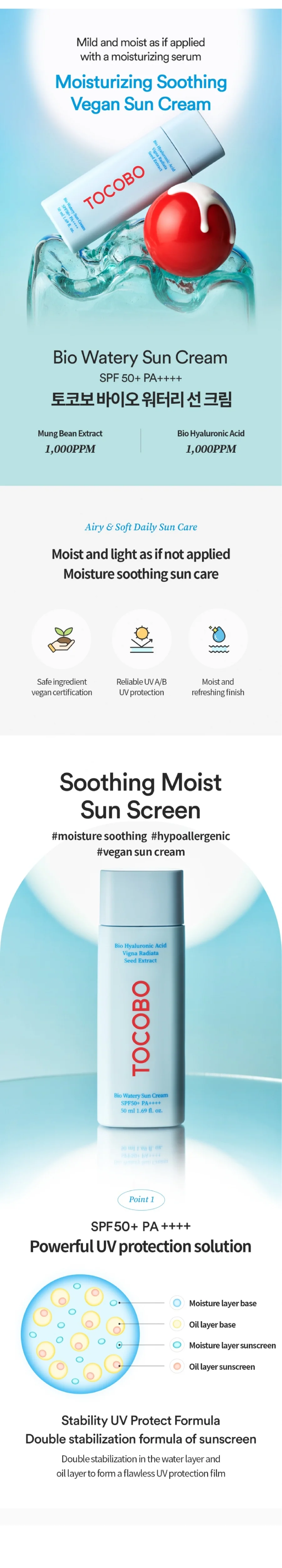 Descripción : Tocobo Bio Watery Sun Cream SPF50+ PA++++ es una crema solar que protege la piel y la mantiene hidratada durante todo el día. Su textura ligera y su rápida absorción facilitan la reaplicación del protector solar a lo largo del día. Enriquecida con extracto de judía mungo y ácido hialurónico. Ambos ingredientes actúan en conjunto para aliviar la piel seca, evitar la pérdida de hidratación y calmar cualquier irritación. El extracto de alubia mungo es también un ingrediente antiinflamatorio que ayuda a las pieles con manchas. La suave fórmula natural está formulada con filtros UV químicos y es segura para los arrecifes de coral.