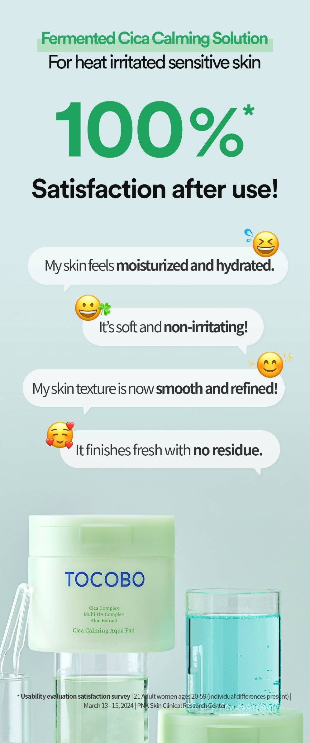 Descripción: TOCOBO Cica Calming Aqua Pads son almohadillas tónicas hipoalergénicas diseñadas para calmar, hidratar y suavizar la piel en un solo paso. Formuladas con Centella Asiática fermentada, Extracto de Hoja de Aloe Ferox y un complejo de Ácido Hialurónico, proporcionan alivio inmediato a pieles sensibles, irritadas o reactivas.