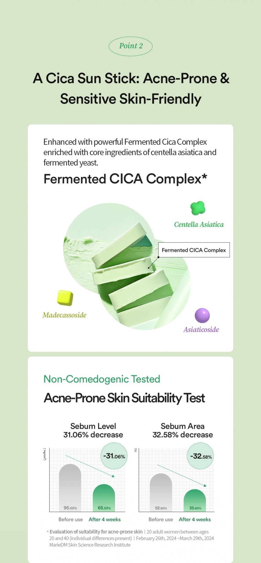 Descripción: Cica Cooling Sun Stick de TOCOBO es un innovador protector solar en formato bálsamo que combina una alta protección solar (SPF50+ PA++++) con una fórmula vegana, no comedogénica y de rápida absorción, ideal para el uso diario. Diseñado especialmente para pieles sensibles y con tendencia al acné, ofrece un efecto refrescante, calmante e hidratante, sin dejar residuos grasos ni obstruir los poros.