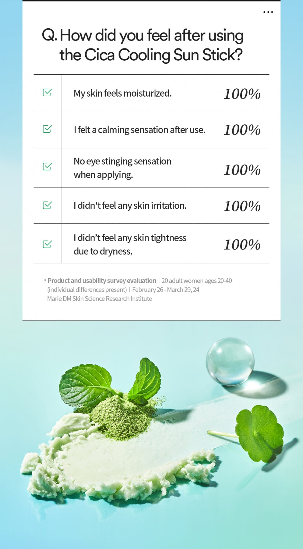 Ingredientes: Aqua, Coco-Caprylate, Synthetic Wax, Dibutyl Adipate, Butyloctyl Salicylate, Butylene Glycol, Diethylamino Hydroxybenzoyl Hexyl Benzoate, Ethylhexyl Triazone, Ozokerite, Caprylic/Capric Triglyceride, Niacinamide, Dimethicone, Polymethylsilsesquioxane, Polysilicone-15, Bis-Ethylhexyloxyphenol Methoxyphenyl Triazine, Centella Asiatica Root Extract, Centella Asiatica Leaf Extract, Centella Asiatica Extract, Sodium Hyaluronate, Stearalkonium Hectorite, Vinyl Dimethicone/Methicone Silsesquioxane Crosspolymer, Sodium Chloride, Glyceryl Caprylate, Caprylyl Glycol, Polyglyceryl-3 Diisostearate, Polyglyceryl-3 Polyricinoleate, Ethylhexylglycerin, Adenosine, Propylheptyl Caprylate, Triethoxycaprylylsilane, 1,2-Hexanediol, Tocopherol, Mentha Arvensis Powder, Saccharomyces Ferment, Asiaticoside, Madecassoside, Dimethylsilanol Hyaluronate, Hydrolyzed Sodium Hyaluronate, Hydrolyzed Hyaluronic Acid, Potassium Hyaluronate, Hyaluronic Acid, Sodium Hyaluronate Crosspolymer, Hydroxypropyltrimonium Hyaluronate, Sodium Hyaluronate Dimethylsilanol, Sodium Acetylated Hyaluronate, Madecassic Acid, Asiatic Acid, Fragrance, CI 77288 (Chromium Oxide Green)