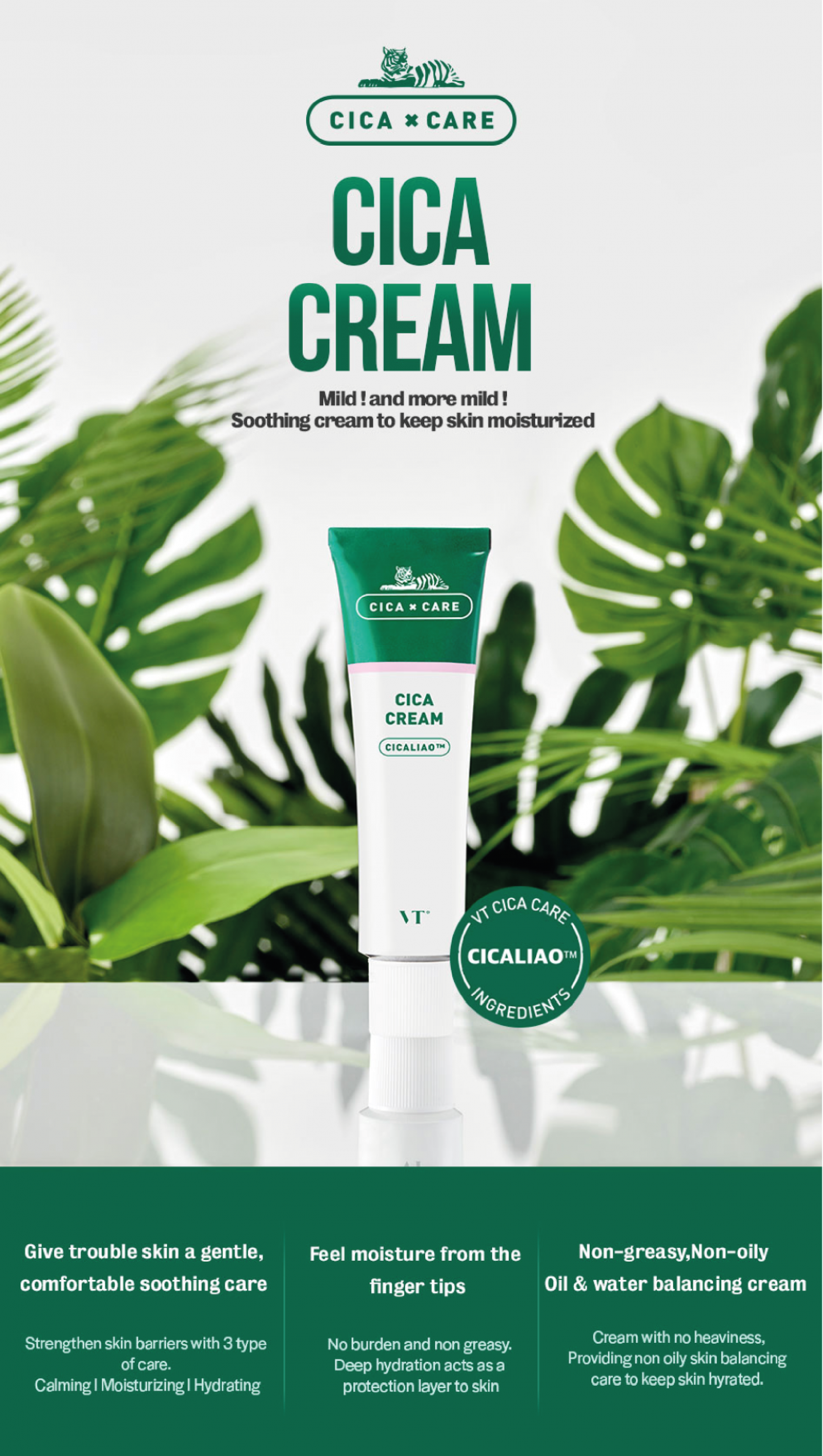 Descripción: VT Cica Cream es una crema facial en gel ligera, ideal para pieles sensibles, mixtas y deshidratadas que sufren irritación y enrojecimiento. Enriquecida con el complejo CICALIO™ (Centella Asiatica, Asiaticoside, Madecassoside, Ácido Asiático y Extracto de Própolis Verde), esta crema calma, regenera y refuerza la barrera cutánea mientras hidrata intensamente sin dejar sensación grasa. Su textura fresca y de rápida absorción deja la piel suave, equilibrada y visiblemente más luminosa.