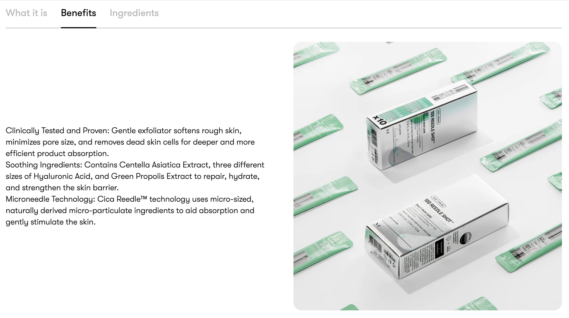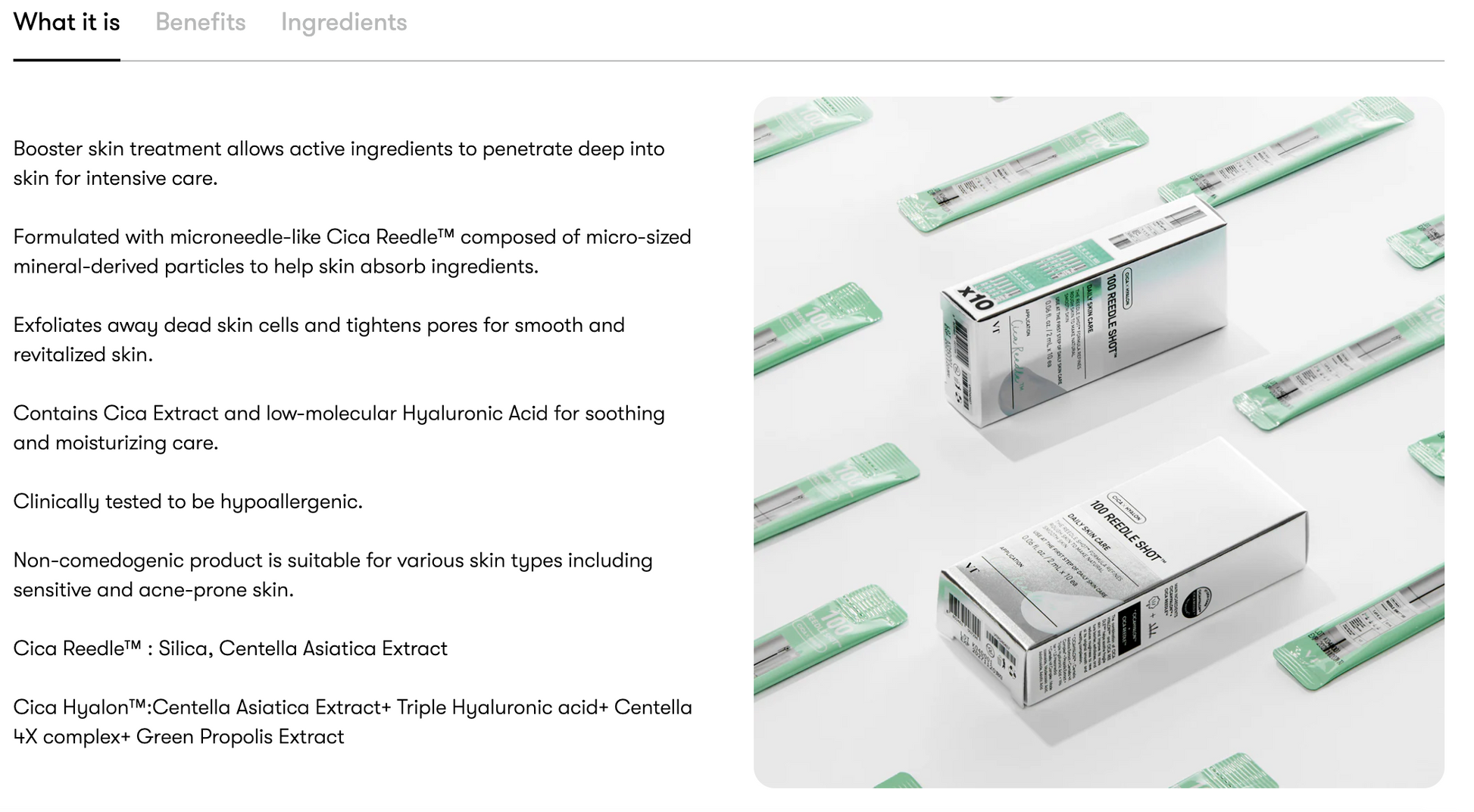 Cada sobre contiene una dosis única del Reedle Shot 100, una fórmula que incorpora microagujas de Cica diseñadas para estimular la piel suavemente y potenciar la absorción de ingredientes activos.
