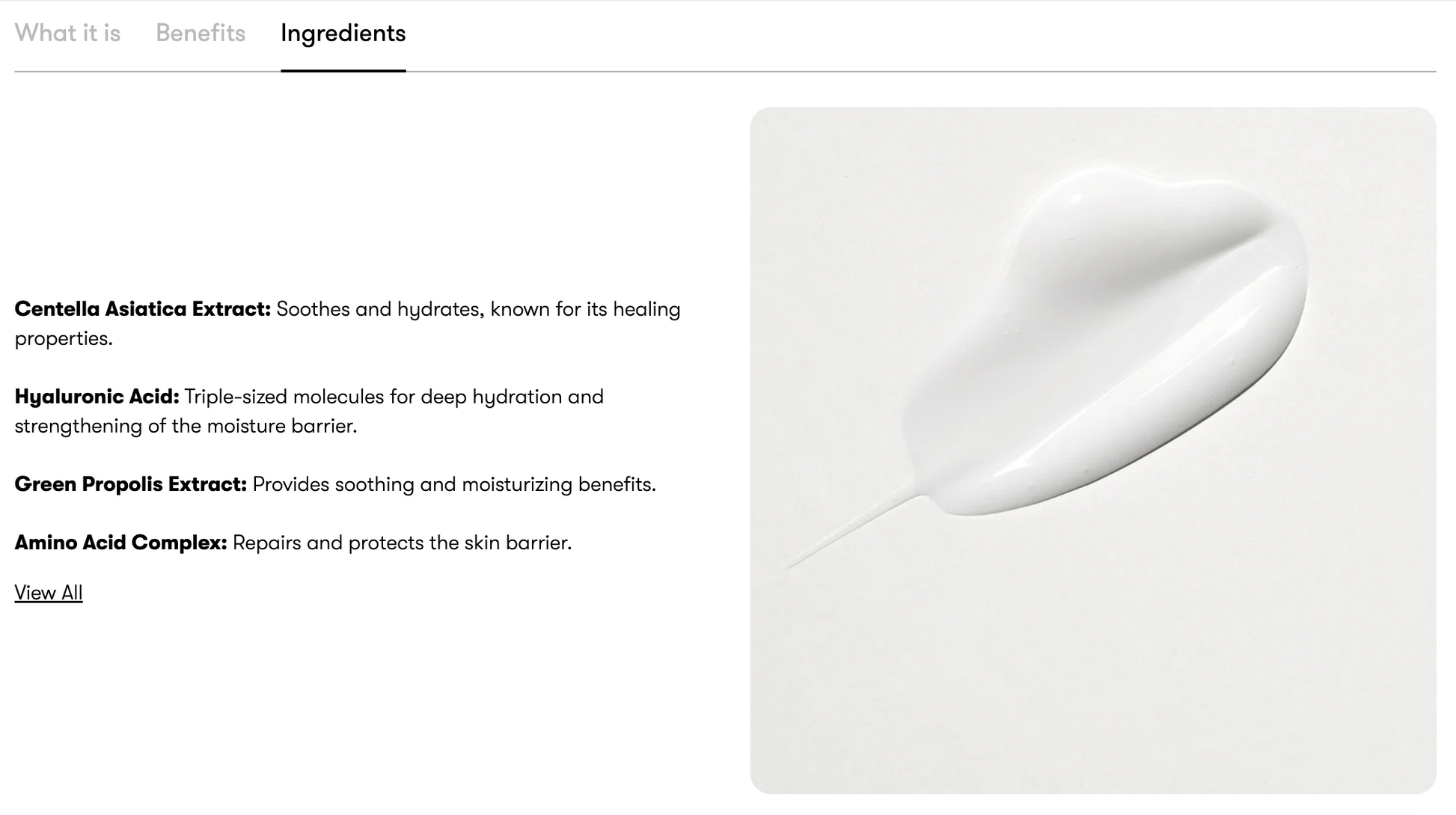 Ingredientes: Agua, Dipropylene Glycol, Glicerina, Niacinamida, Butylene Glycol, Aceite de Semilla de Macadamia Ternifolia, 1,2-Hexanodiol, Palmitato de Etilhexilo, Copolímero de Acrilato de Sodio/Acriloildimetil Taurato de Sodio, Poliisobuteno, Sílice, Glycereth-26, Etilhexilglicerina, Caprylyl Glycol, Adenosina, Poliacrilato de Sodio, Hialuronato de Sodio, Extracto de Centella Asiática, Caprylyl/Capryl Glucoside, Sorbitan Oleate, Goma Xantana, Extracto de Propóleo, Asiaticoside, Madecassoside, Ácido Madecásico, Ácido Asiático, Complejo de Aminoácidos (Glicina, Serina, Ácido Glutámico, Aspártico, Leucina, Alanina, Lisina, Arginina, Tirosina, Fenilalanina, Treonina, Prolina, Valina, Isoleucina, Histidina, Metionina, Cisteína).