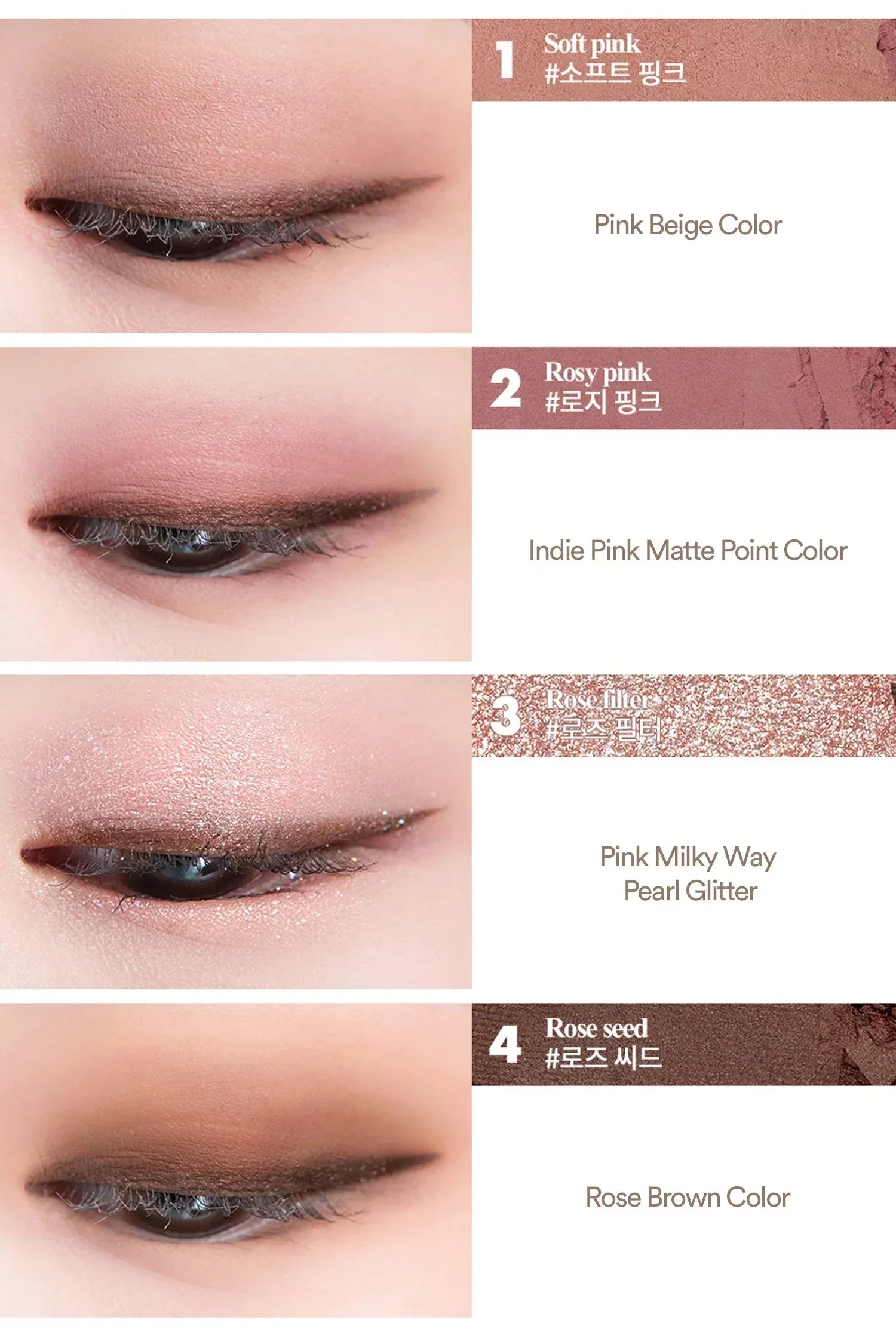 Descripción: Rom&nd Better Than Eyes Shadow Palette es una paleta de sombras de ojos con cuatro tonos armoniosos en acabados mate y shimmer, diseñada para crear looks versátiles, desde maquillaje diario hasta estilos más sofisticados y especiales.