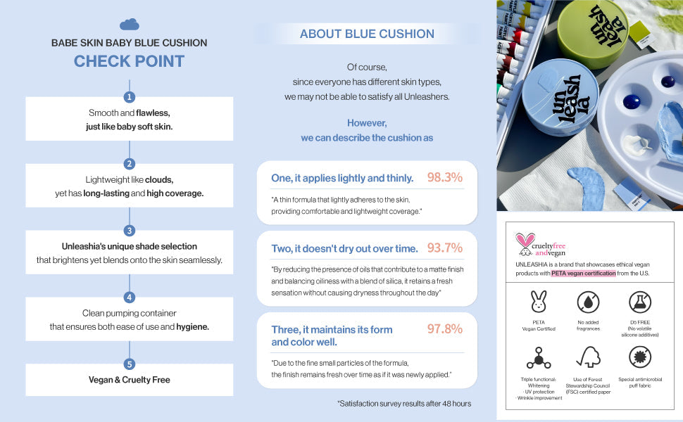Descripción: Babe Skin Baby Blue Cushion de Unleashia es una base de maquillaje vegana con cobertura alta que disimula granitos, manchas y rojeces, dejando la piel con un acabado semimate, natural y sin brillos. Su fórmula ligera pero eficaz ayuda a corregir el tono de la piel mientras la mantiene hidratada y protegida gracias a su SPF40 PA++.